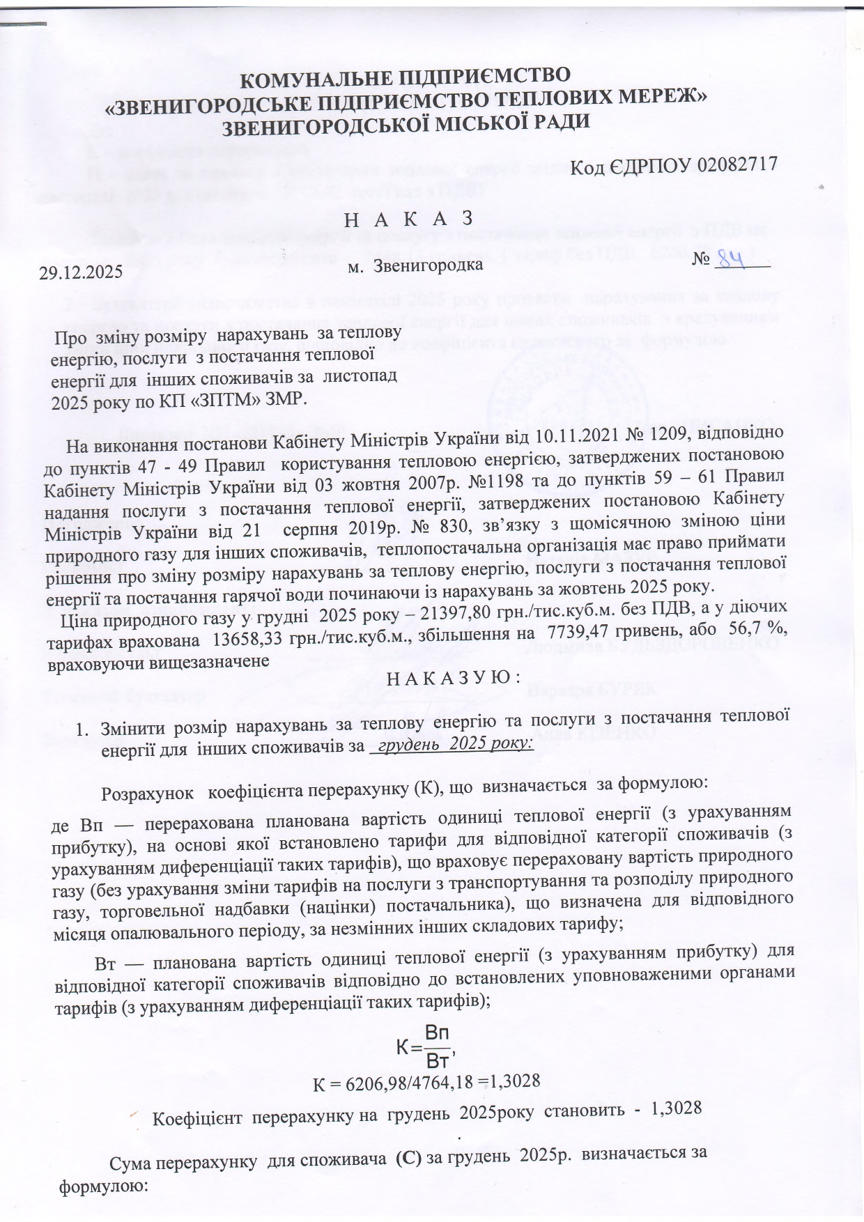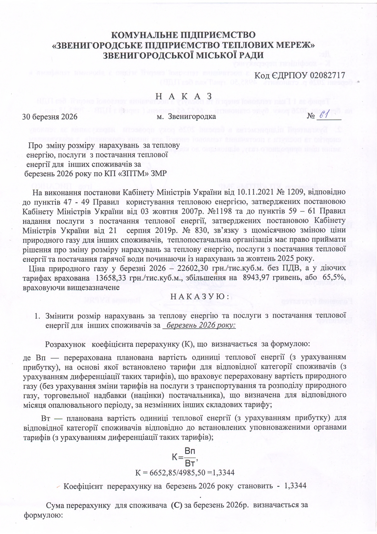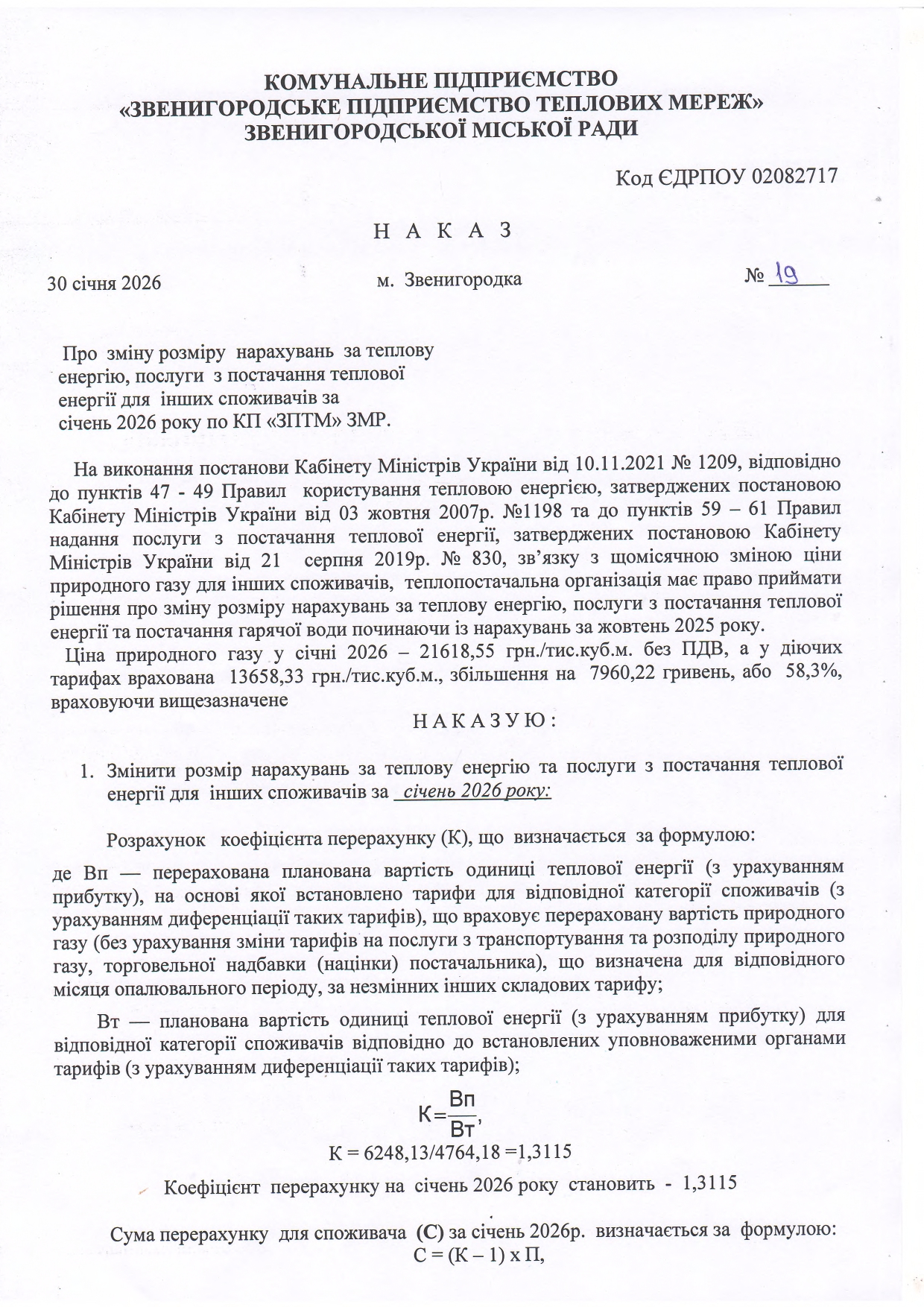 В зв'язку з щомісячною зміною ціни природного газу постачальною організацією,Кабінетом Міністрів України прийнято постанову від 10.11.2021 №1209 «Деякі питання нарахування (визначення) плати за теплову енергію, послуги з постачання теплової енергії та постачання гарячої води у зв'язку із зміною ціни природного газу», яка набрала чинності з 23.11.2021 року. Відповідно до даної постанови теплопостачальна організація має право приймати рішення про зміну розміру нарахувань за теплову енергію, послуги з постачання теплової енергії та постачання гарячої води.