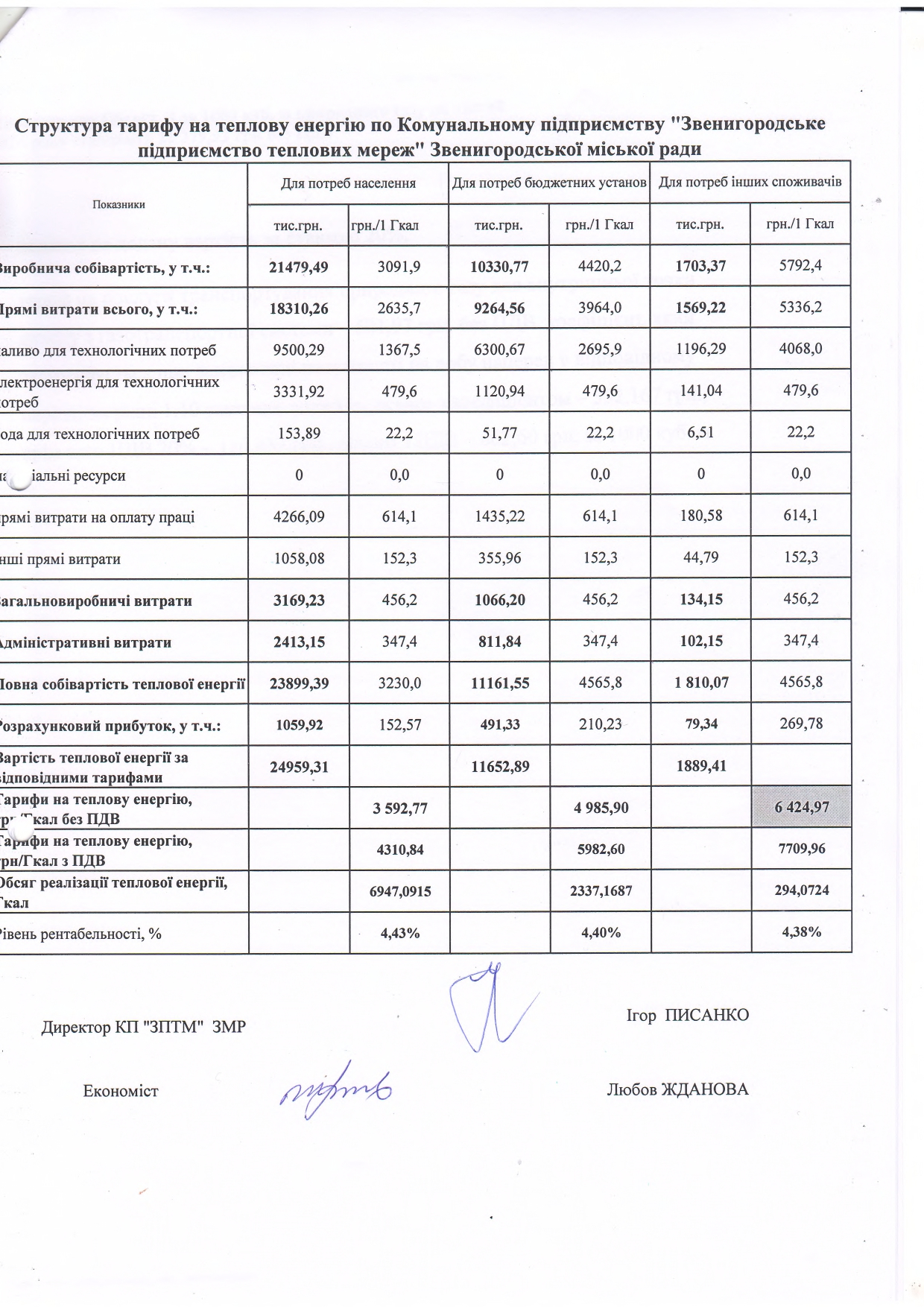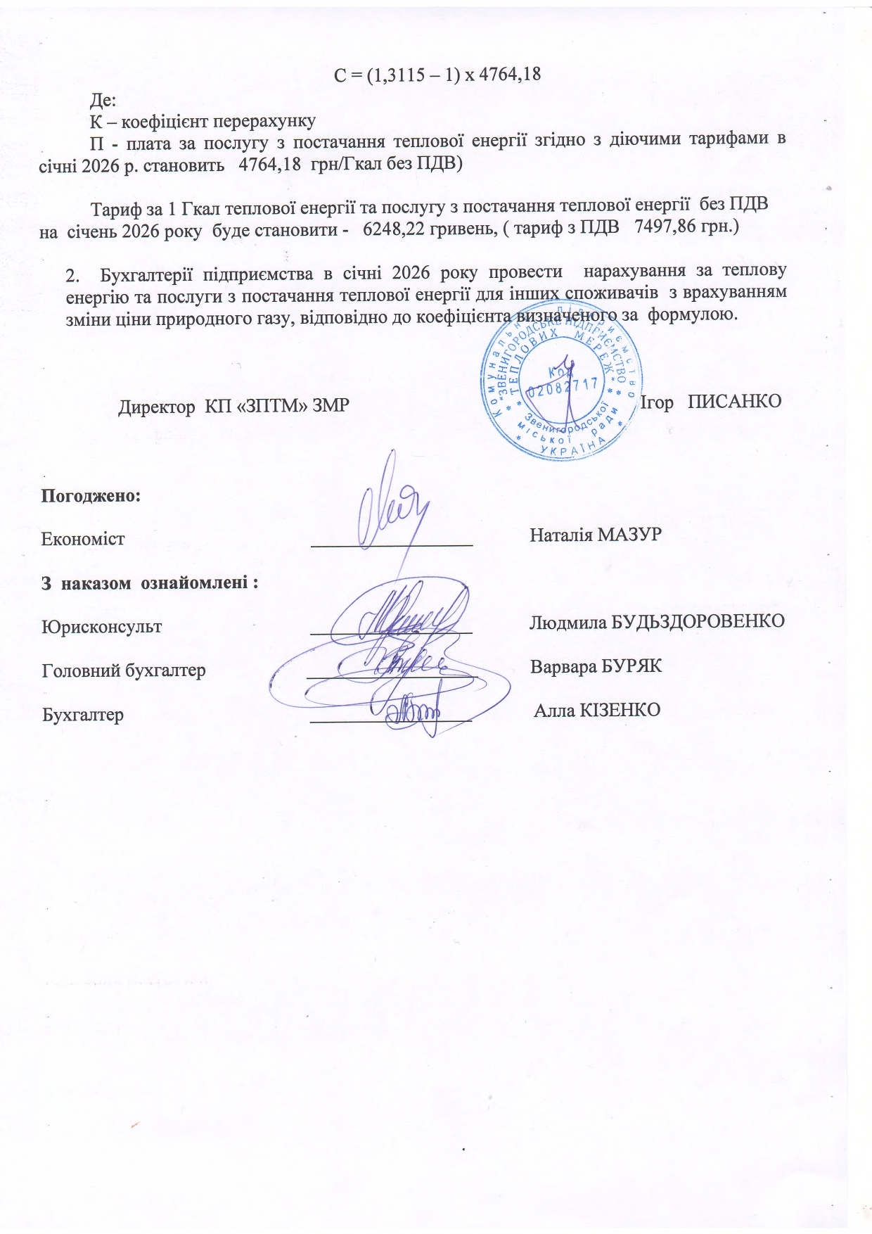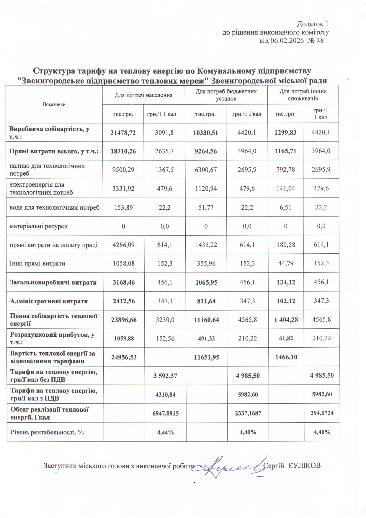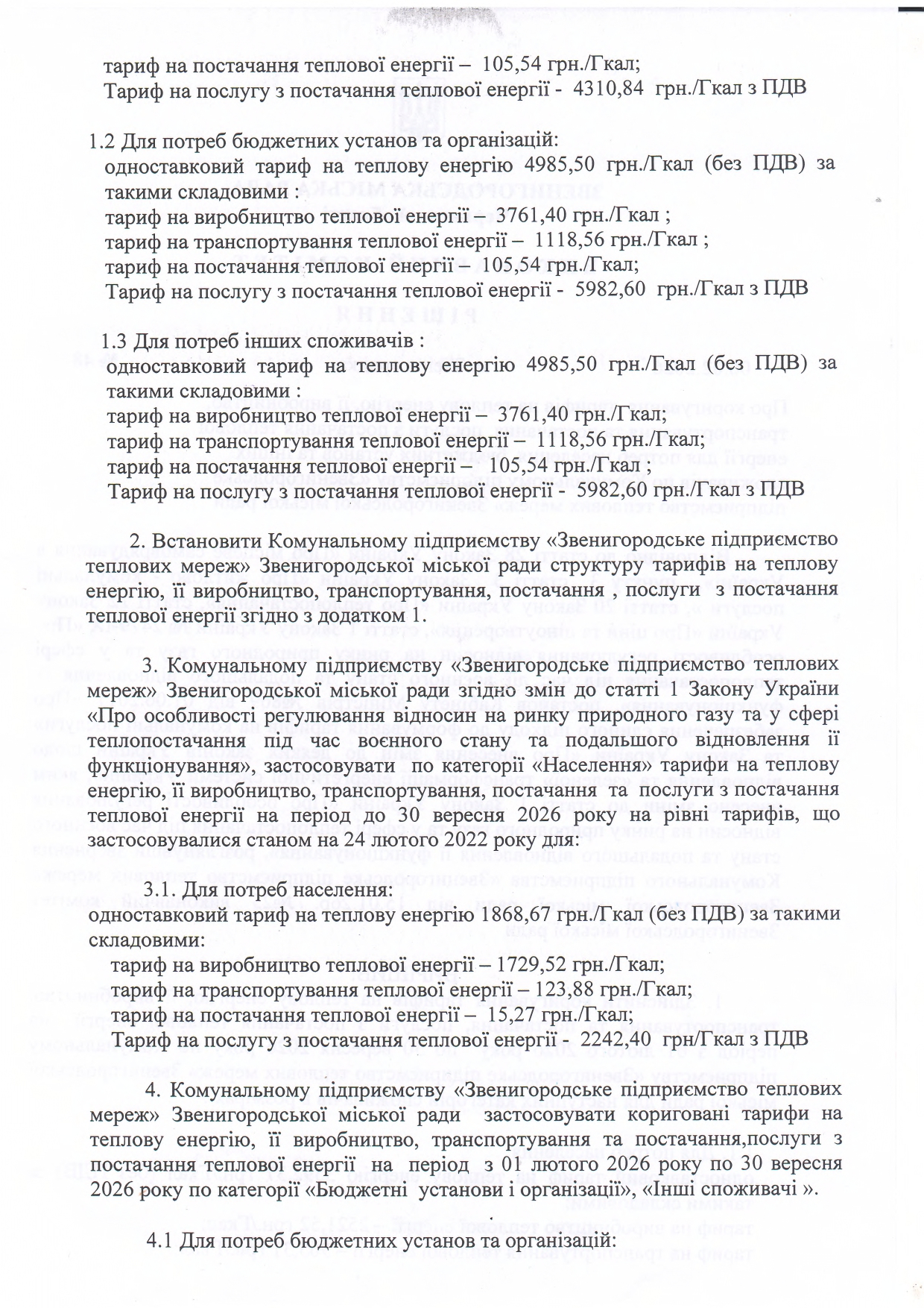На даний час, для всіх груп споживачів, на підприємстві діють тарифи на теплову енергію (виробництво, транспортування та постачання) та тарифи на послугу з постачання теплової енергії затверджені рішенням Виконавчого комітету Звенигородської міської ради від 23.07.2024р. за № 305. Відповідно до статті 1 Закону України «Про особливості регулювання відносин на ринку природного газу та у сфері теплопостачання під час воєнного стану та подальшого відновлення ії функціонування», по категорії «Населення» застосовуються тарифи на теплову енергію, її виробництво, транспортування, постачання та послуги з постачання теплової енергії на рівні тарифів, що застосовувалися станом на 24 лютого 2022 року (не змінні з 2018року) - 2242,40 грн/Гкал з ПДВ.