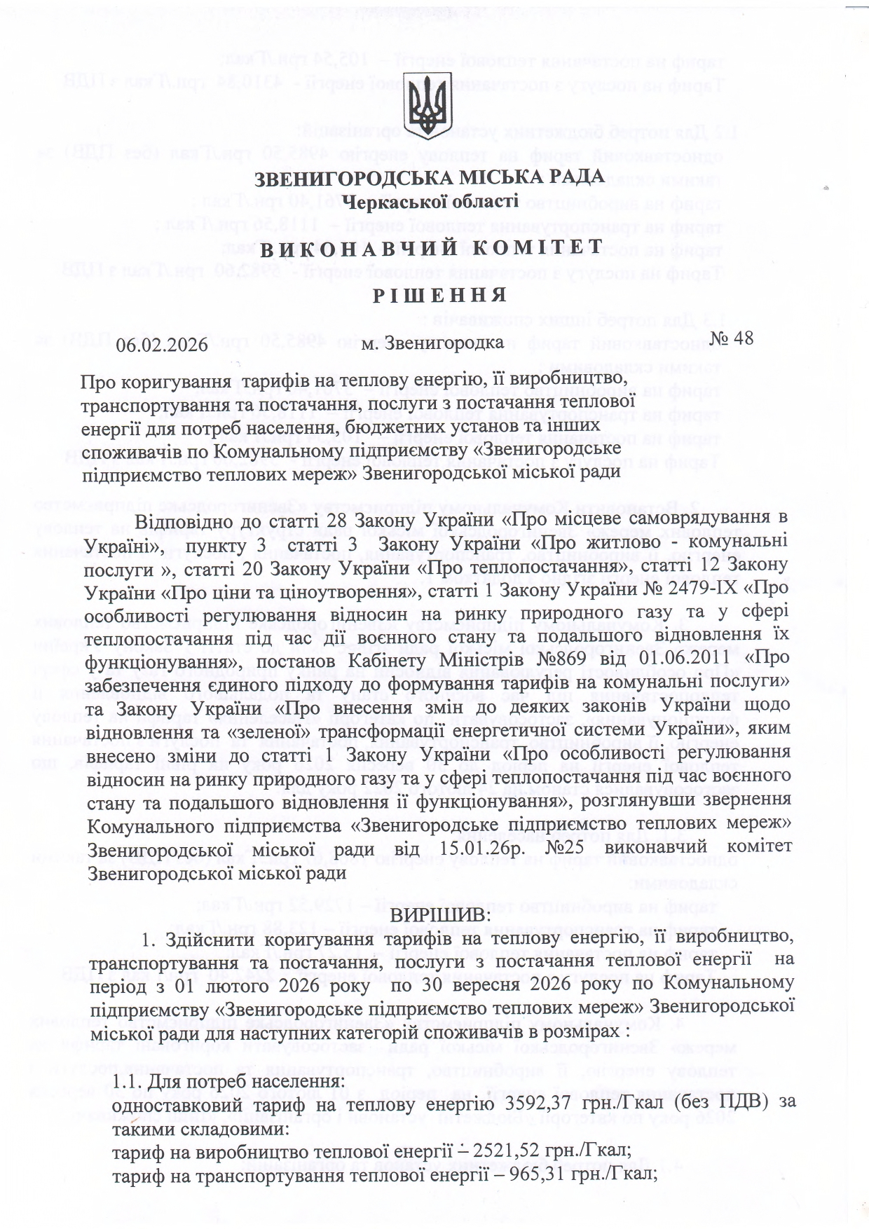 ПОВІДОМЛЕННЯ про коригування тарифів на послуги з постачання теплової енергії, встановлених рішенням Виконавчого комітету Звенигородської міської ради № 234 від 22 липня 2025 року передбачено: