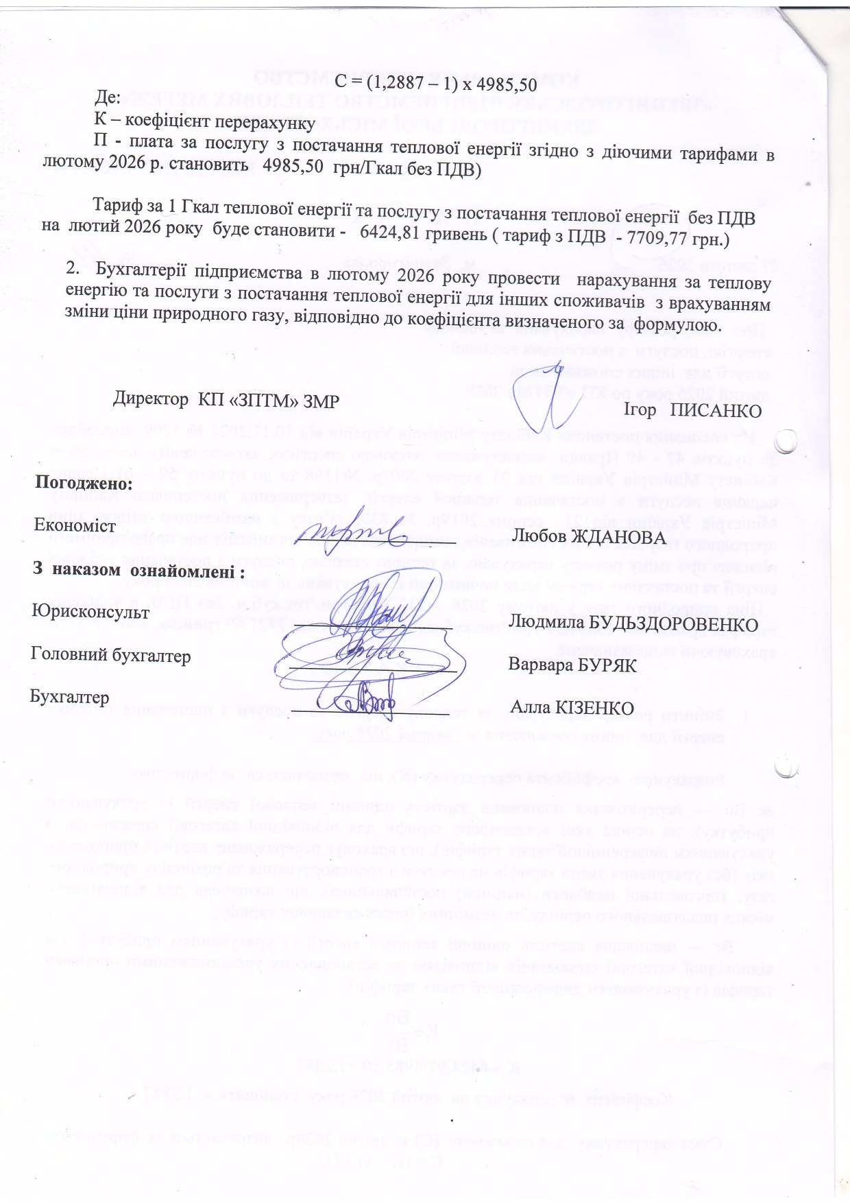 На виконання Закону України «Про житлово-комунальні послуги» від 09.11.2017 № 2189-VIII, Закону України «Про комерційний облік теплової енергії та водопостачання», постанови КМУ від 21.08.2019 №830 «Про затвердження послуги з постачання теплової енергії і типових договорів про надання послуги з постачання теплової енергії», у відповідності до вимог постанови КМУ від 01.06.2011 № 869 зі змінами та доповненнями, Закону України «Про внесення змін до деяких законів України щодо відновлення та «зеленої» трансформації енергетичної системи України», яким внесено зміни до статті 1 Закону України «Про особливості регулювання відносин на ринку природного газу та у сфері теплопостачання під час воєнного стану та подальшого відновлення її функціонування» та з метою встановлення економічно обґрунтованих тарифів на послугу з постачання теплової енергії , підприємством проведено розрахунки нових тарифів.