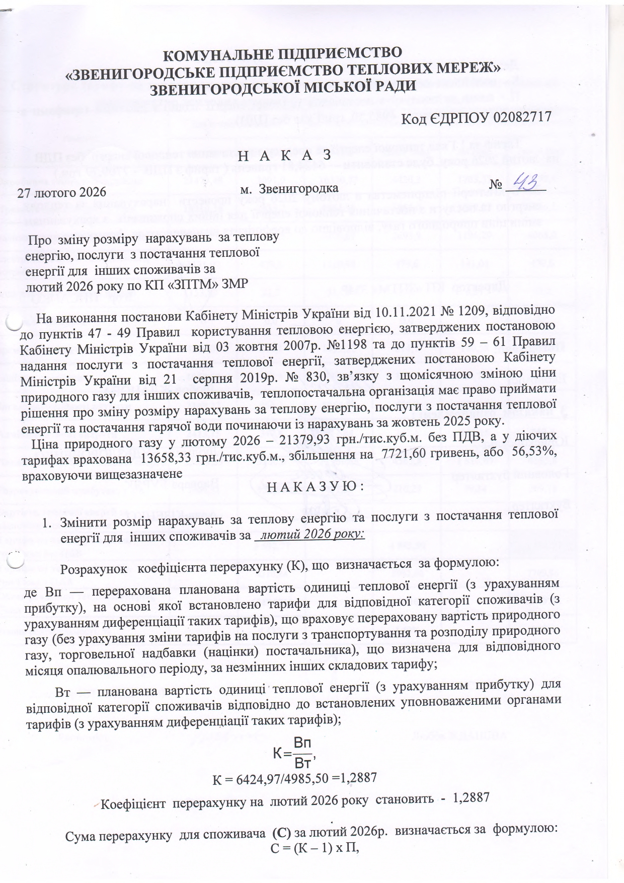 На виконання Закону України «Про житлово-комунальні послуги» від 09.11.2017 № 2189-VIII, Закону України «Про комерційний облік теплової енергії та водопостачання», постанови КМУ від 21.08.2019 №830 «Про затвердження послуги з постачання теплової енергії і типових договорів про надання послуги з постачання теплової енергії», у відповідності до вимог постанови КМУ від 01.06.2011 № 869 зі змінами та доповненнями, Закону України «Про внесення змін до деяких законів України щодо відновлення та «зеленої» трансформації енергетичної системи України», яким внесено зміни до статті 1 Закону України «Про особливості регулювання відносин на ринку природного газу та у сфері теплопостачання під час воєнного стану та подальшого відновлення ії функціонування» та з метою встановлення економічно обґрунтованих тарифів на послугу з постачання теплової енергії , підприємством проведено розрахунки нових тарифів.